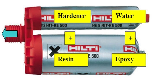 - Hóa chất Hilti-RE-500 là loại Epoxy không mùi, màu hồng nhạt khi hòa trộn. Được đóng gói trong gói nhựa dẻo gồm hai thành phần rất thuận tiện trong qúa trình vận chuyển và sử dụng. Chỉ cần dùng tay vặn mở nắp đậy bảo vệ và lắp vũi xoắn là sử dụng được;